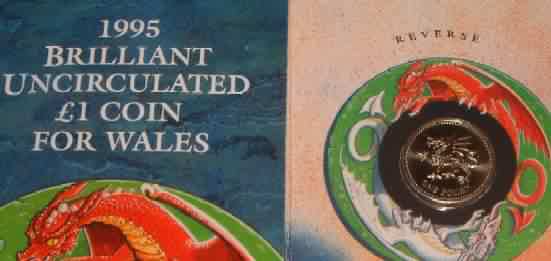| 1995 Welsh 1 Pound Coin Welsh Dragon in official issue foldout flat pack (Nickel Brass) £1 |
