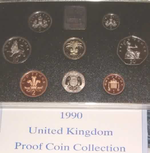 | 1990 Proof Set. (Currency) £1 Welsh Leek,50p,20p,10p,5p Large Type last year of issue & 5p New small type first year of issue,2p,1p.Blue case of issue & COA |